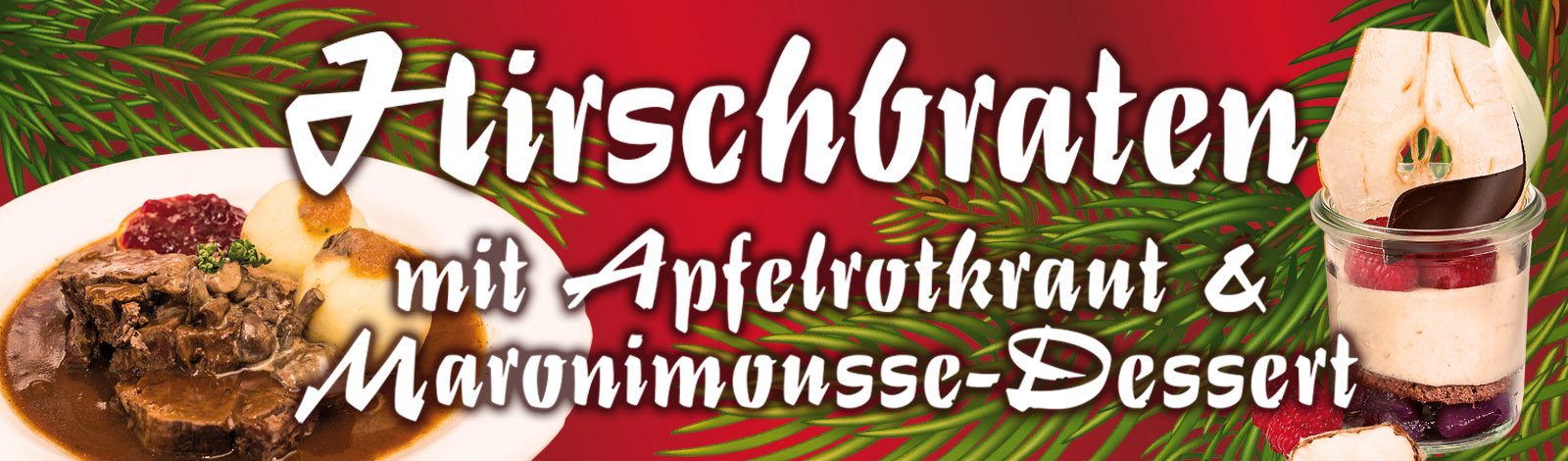 Hauptgang: Hirschbraten mit Apfelrotkraut und Rosmarinkartoffeln oder wahlweise Kartoffelklöße